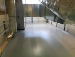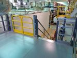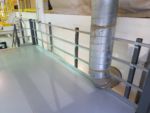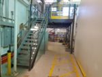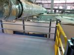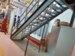 The mezzanine that was provided was an L-shaped mezzanine and was roughly 1,000 square feet. It included about 150 linear feet of handrail, a double swing gate for pallet access, a straight staircase and resin board flooring. We worked closely with our installer and the customer to make sure that the mezzanine would be installed properly with limited interruption to their current operations. To account for the weight of the piece of equipment that needed to be stored, the decision was made for the equipment to sit directly on the structural steel beams and joists, rather than sit on the resin board. The structural steel was specifically designed in this area to accommodate the direct load.