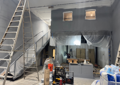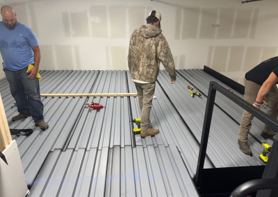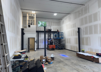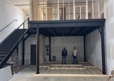 Mezzanine Distributors designed, engineered, fabricated, and installed a 420-square-foot mezzanine finished in custom paint colors, including the underside of the flooring and matching hardware for a consistent look. The project featured an upgraded cable-style railing system with a coordinated color scheme. The mezzanine will house two offices above, with a golf simulation business below, creating a flexible, customized space.