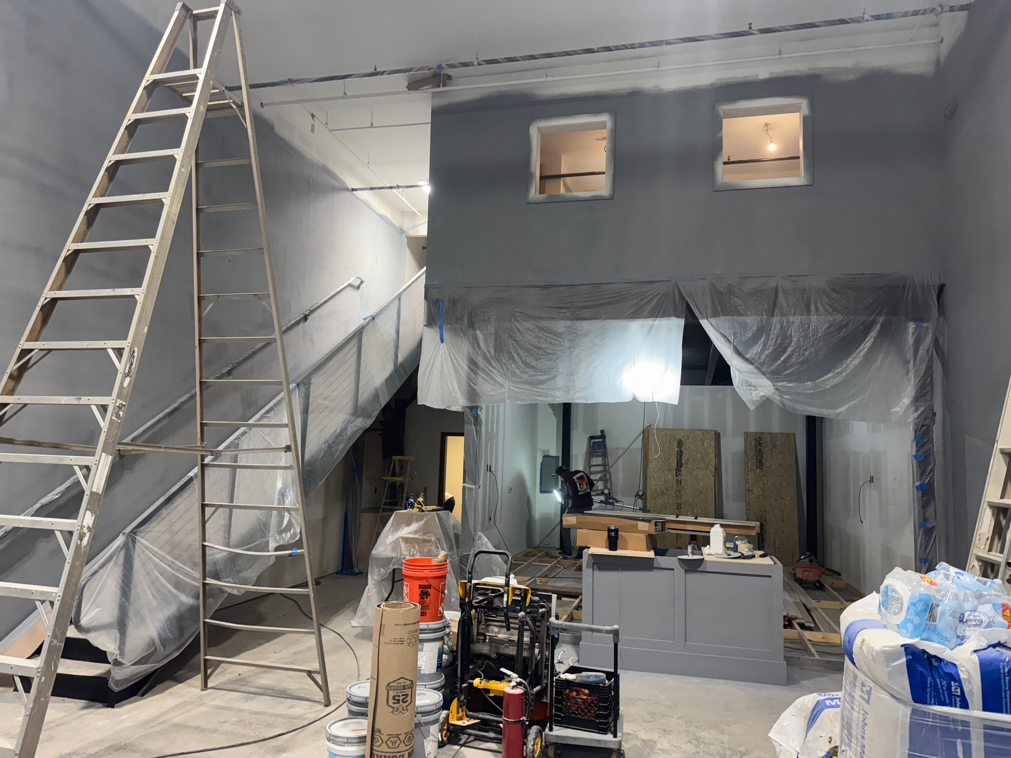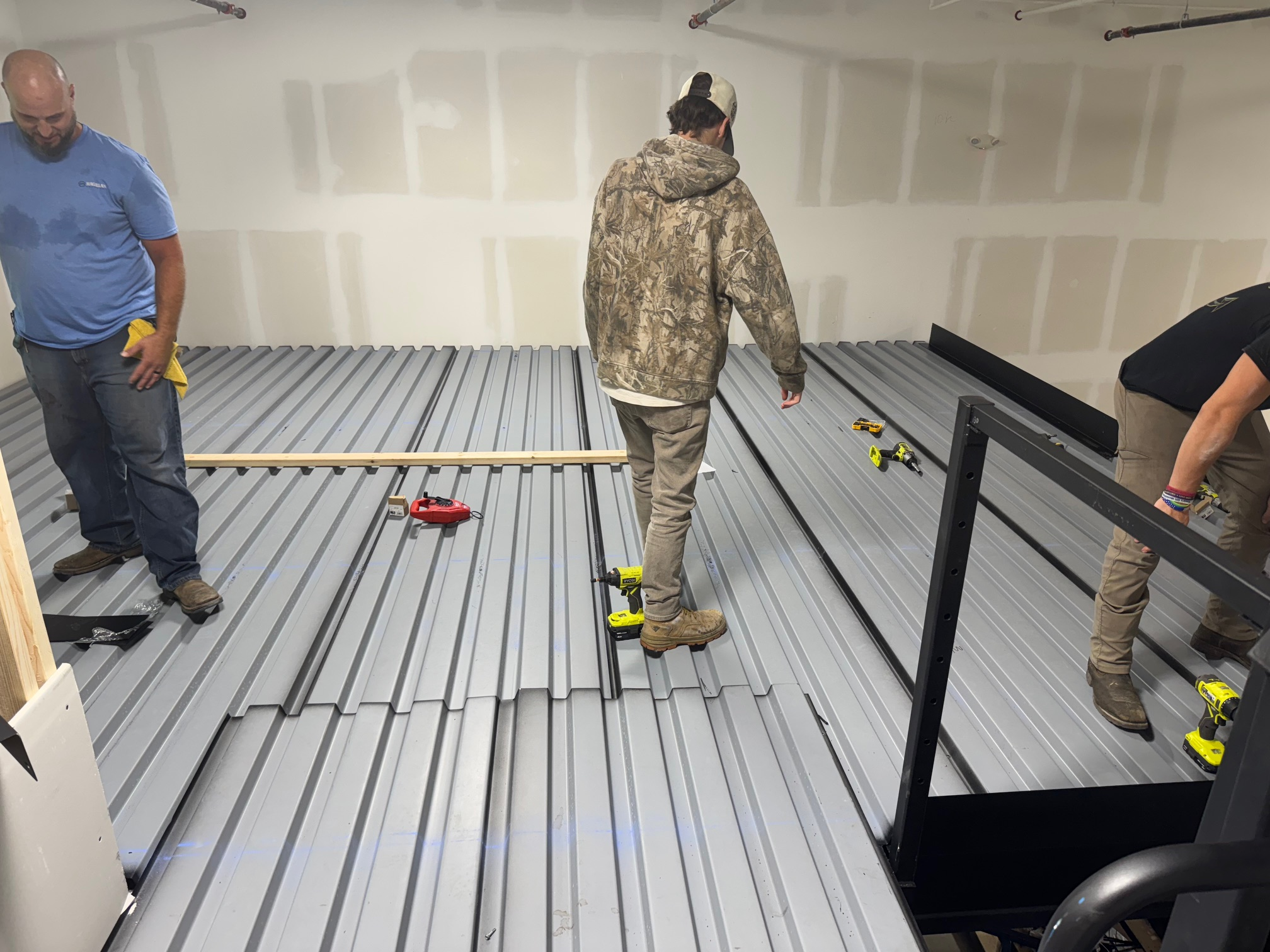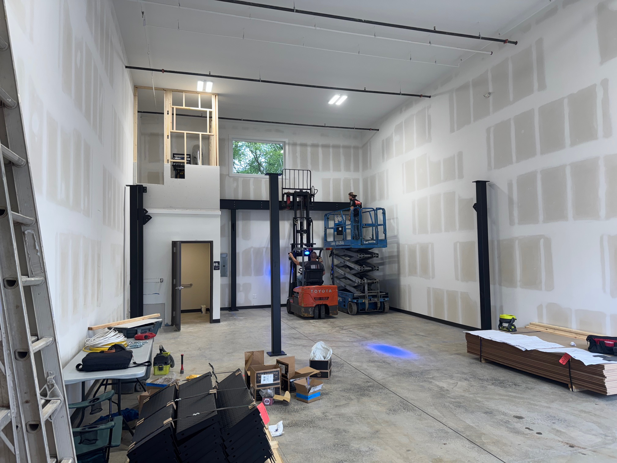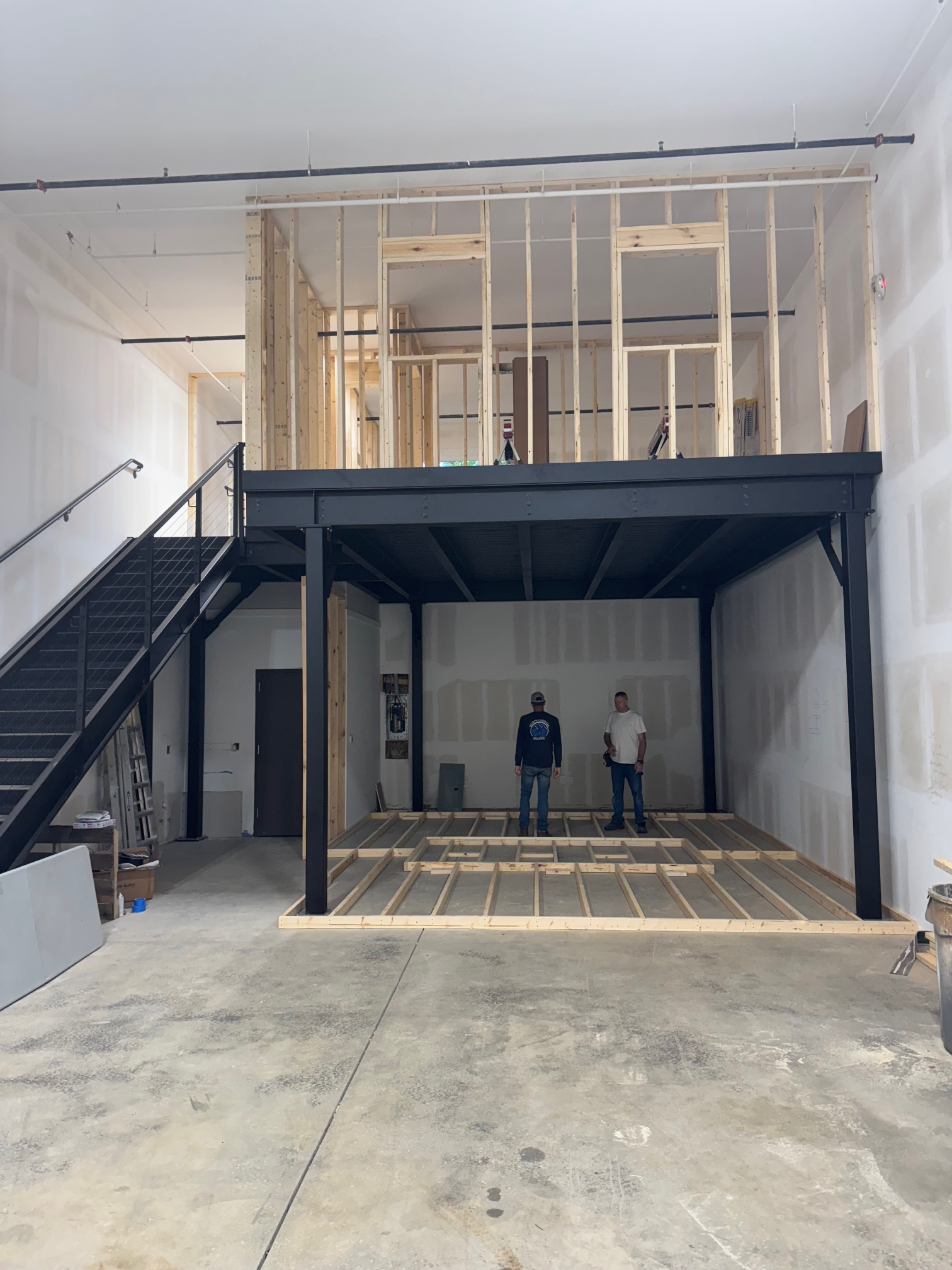Mezzanine Distributors designed, engineered, fabricated, and installed a 420-square-foot mezzanine finished in custom paint colors, including the underside of the flooring and matching hardware for a consistent look. The project featured an upgraded cable-style railing system with a coordinated color scheme. The mezzanine will house two offices above, with a golf simulation business below, creating a flexible, customized space.