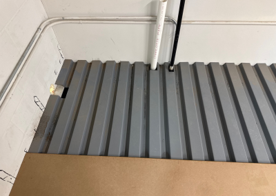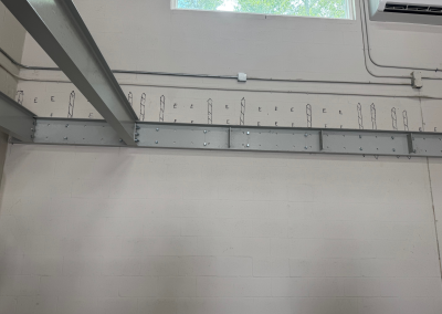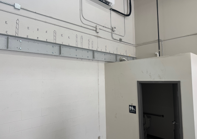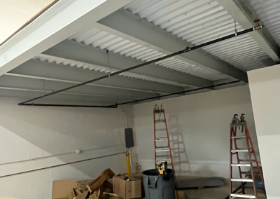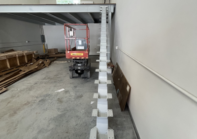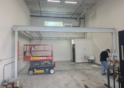 Mezzanine Distributors designed, engineered, fabricated, and installed a 470-square-foot mezzanine finished with custom paint colors to meet the owner’s specifications. Unlike most free-standing builds, this project required attaching a 23-foot structural C-channel to the back wall, which meant scanning for rebar, field-drilling holes, and adapting beyond the original drawings to ensure a secure installation.