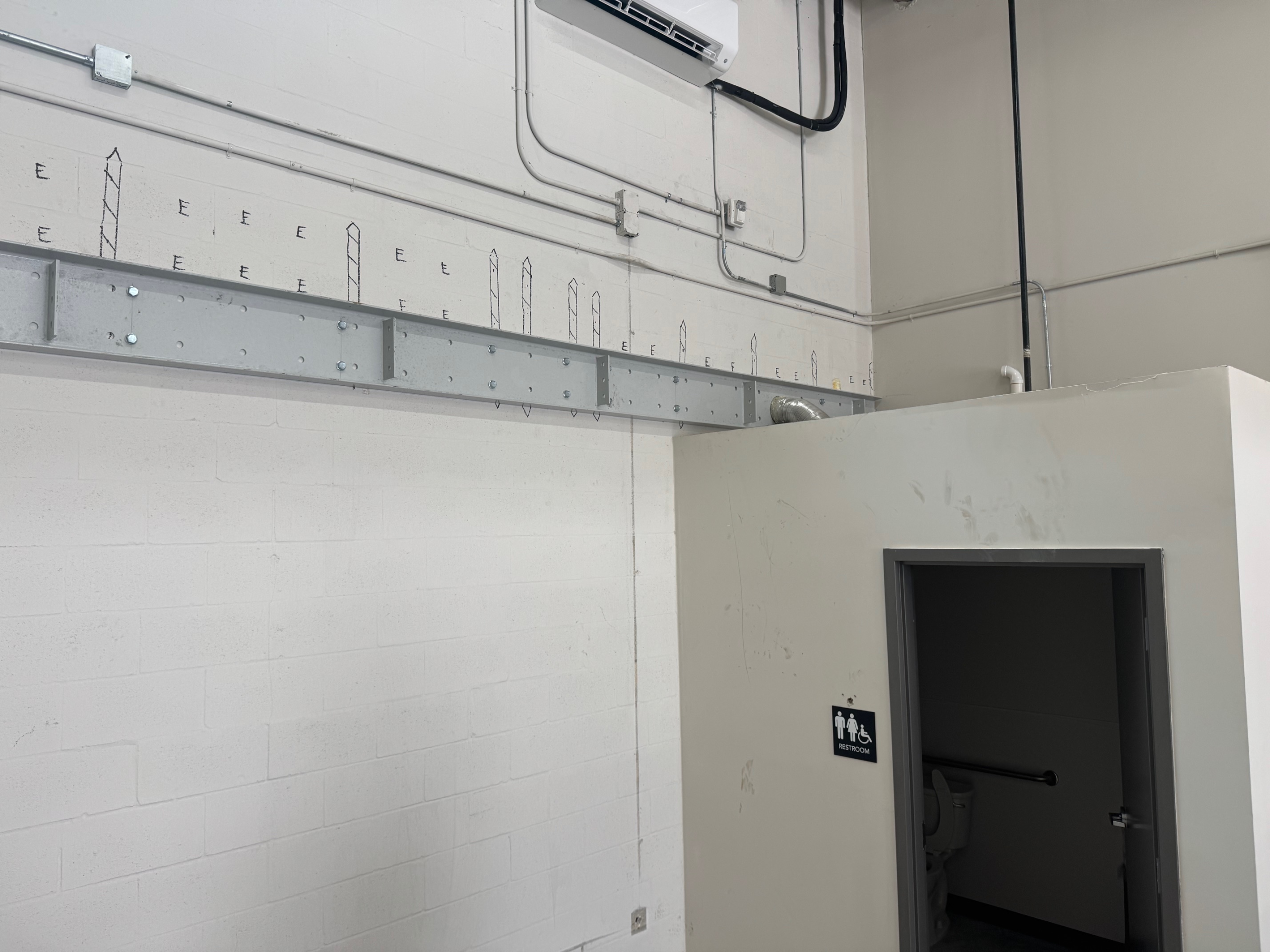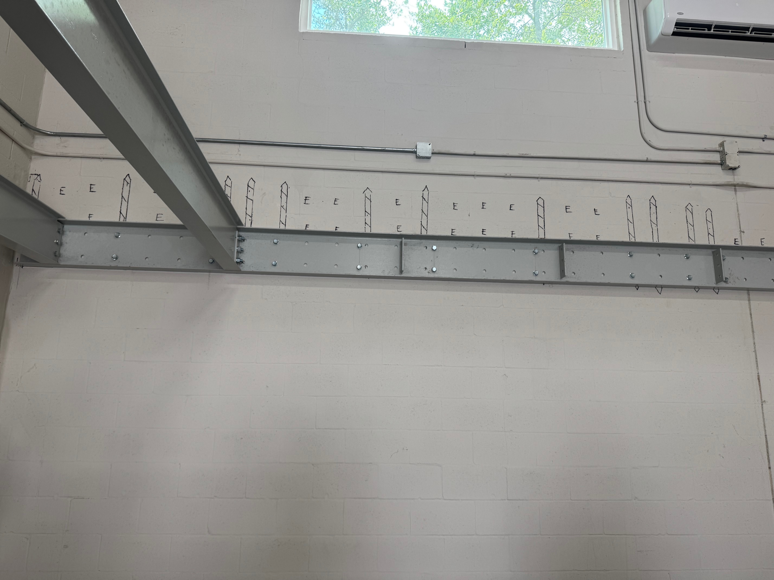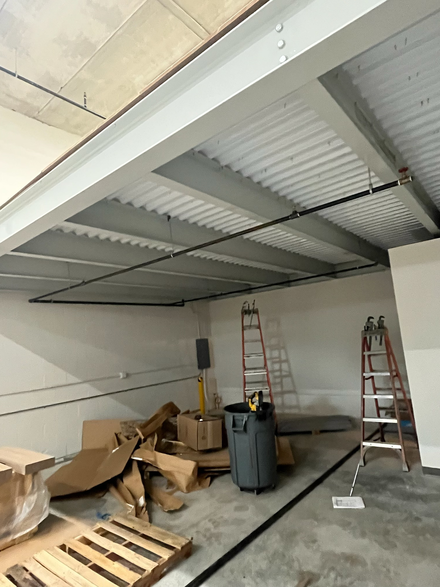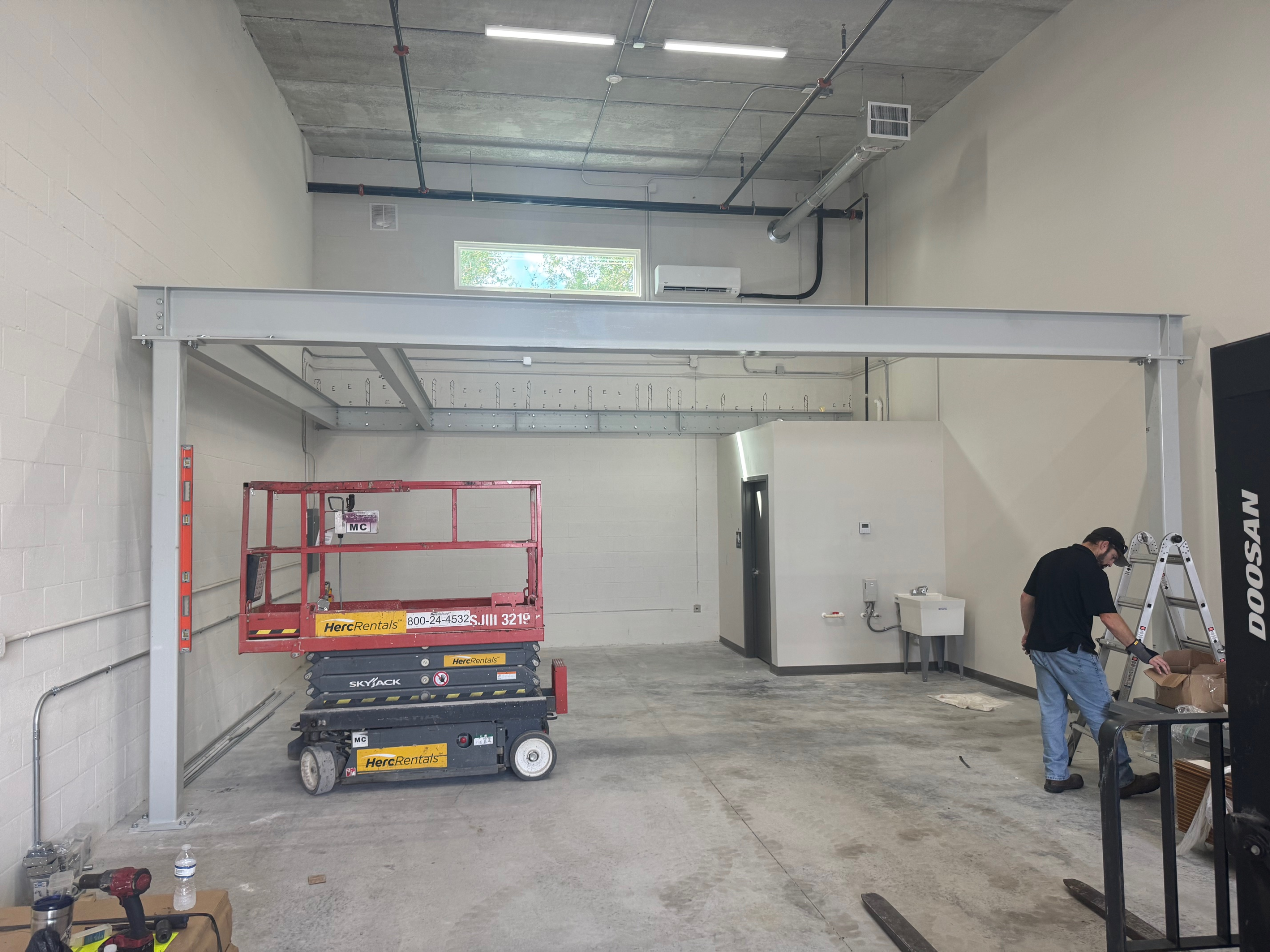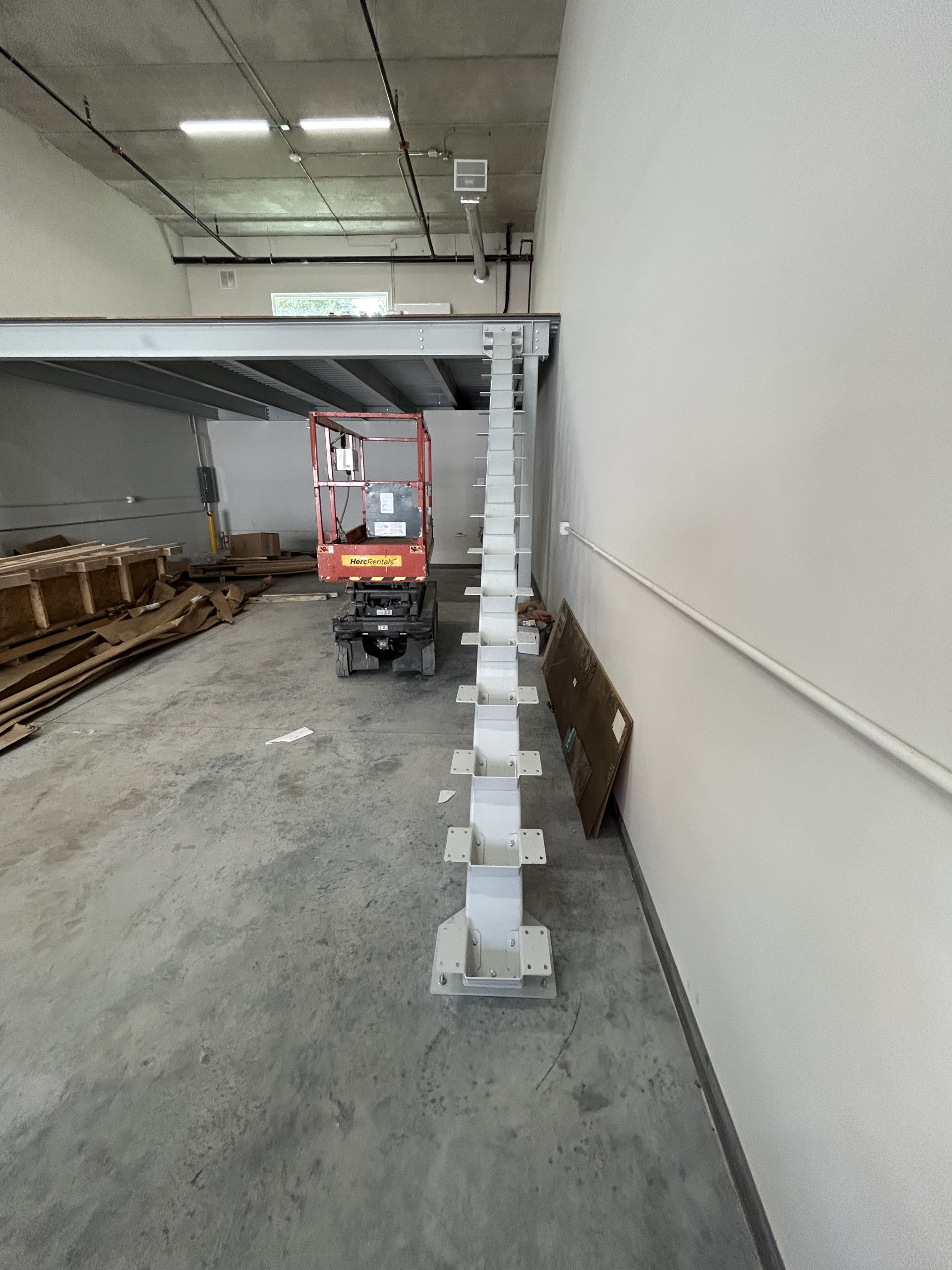 Mezzanine Distributors designed, engineered, fabricated, and installed a 470-square-foot mezzanine finished with custom paint colors to meet the owner’s specifications. Unlike most free-standing builds, this project required attaching a 23-foot structural C-channel to the back wall, which meant scanning for rebar, field-drilling holes, and adapting beyond the original drawings to ensure a secure installation.